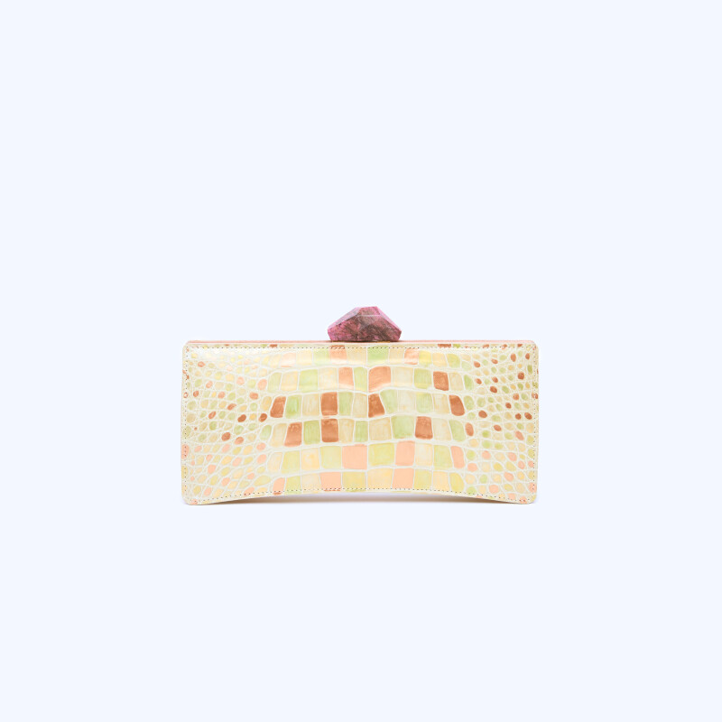 "Ashley" Cigarette Arlequin pochette, an exclusive creation crafted with expertise using fine Alligator leather, hand-painted for a unique touch and rodonite pulsoir.