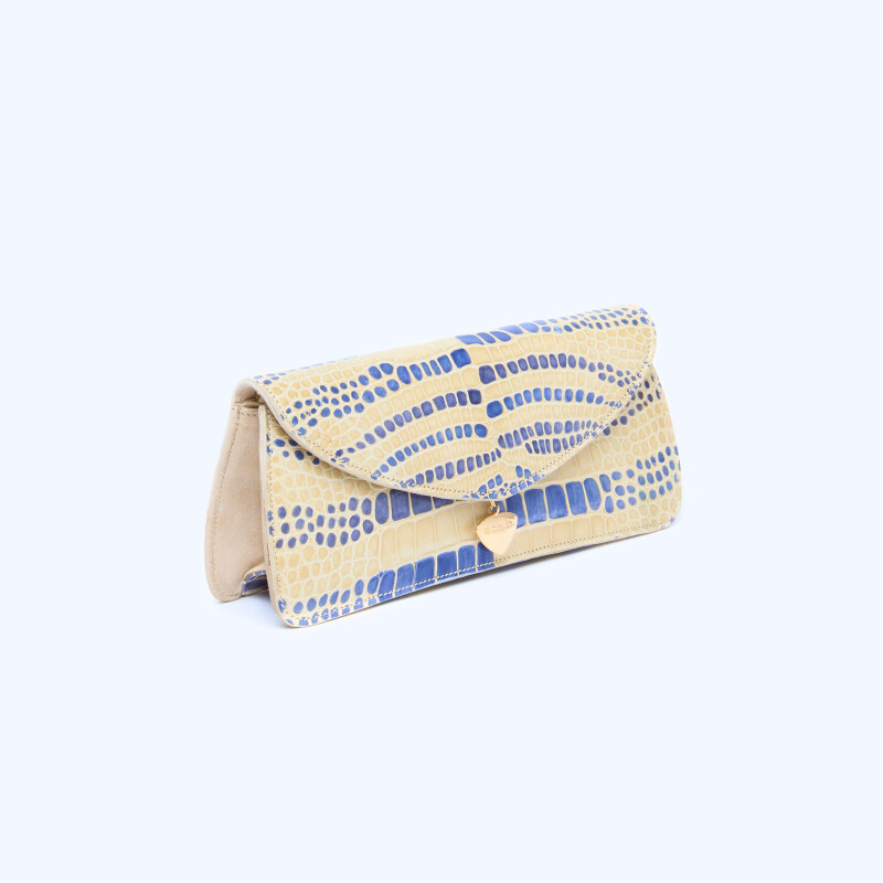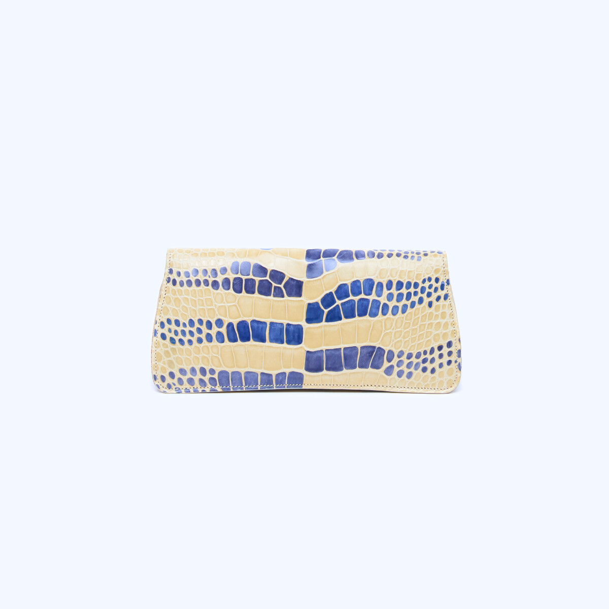 "Ellie" Arlequin Pochette, an exclusive creation expertly crafted using fine Alligator leather and suede details, hand-painted for a unique touch. Handmade closure in 3-micron yellow gold.