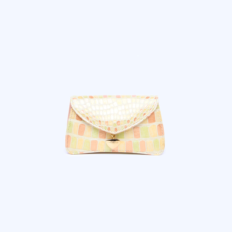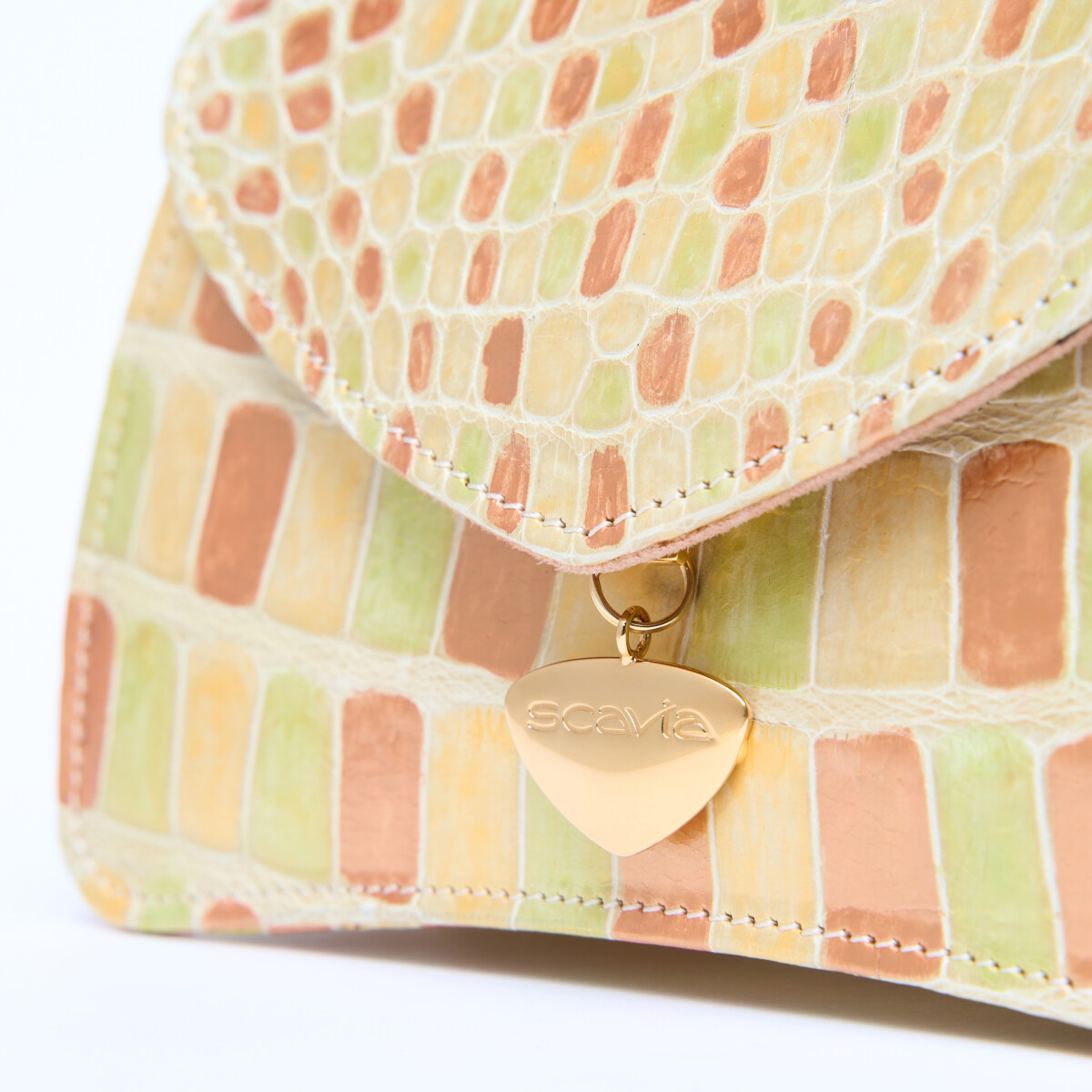 "Ellie" Arlequin Pochette, an exclusive creation expertly crafted using fine Alligator leather and suede details, hand-painted for a unique touch. Handmade closure in 3-micron yellow gold.