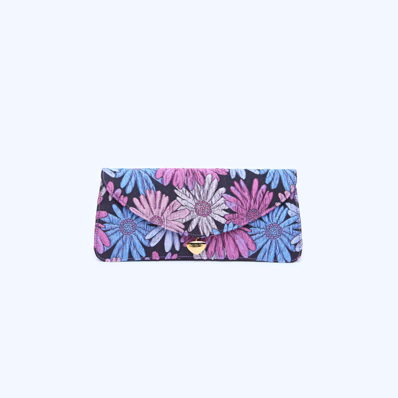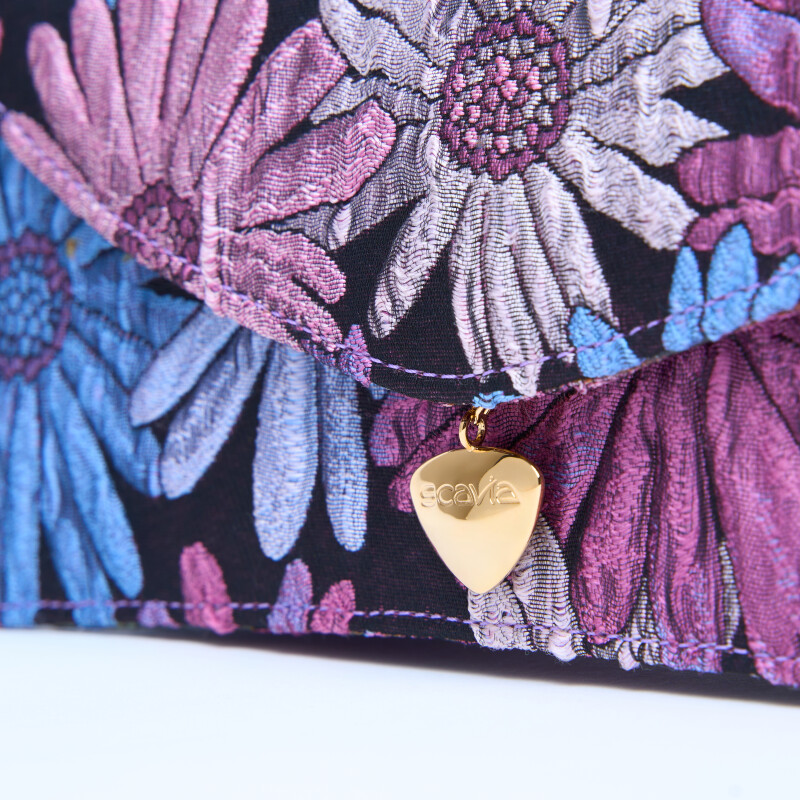 "Ellie" flowers Pochette cigarette, part of our limited collection, made with fine lilac floral fabric. Handcrafted closure in 3-micron yellow gold.