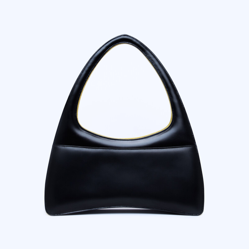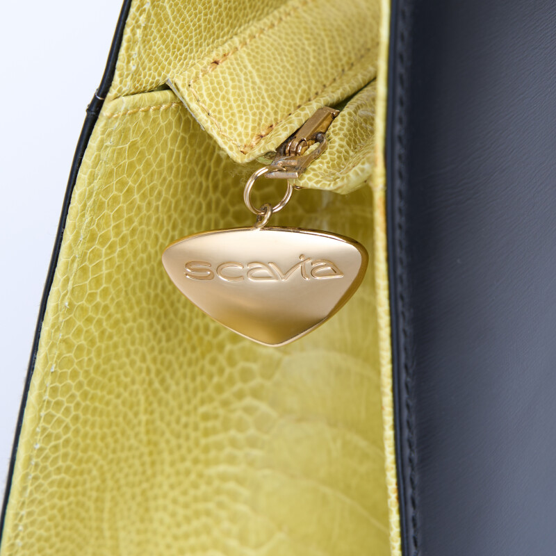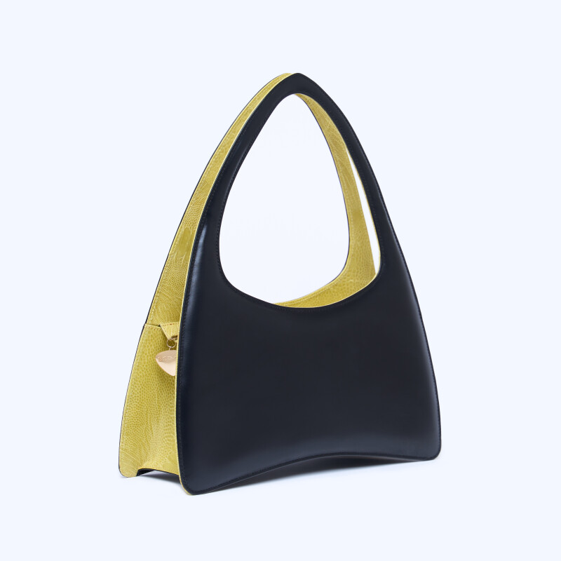 "Ellie" Triangle handbag, made of fine calfskin and ostrich leg. Handmade closure with 3-micron gold plating.