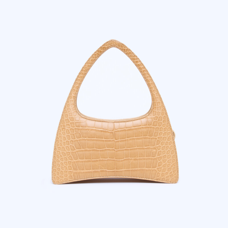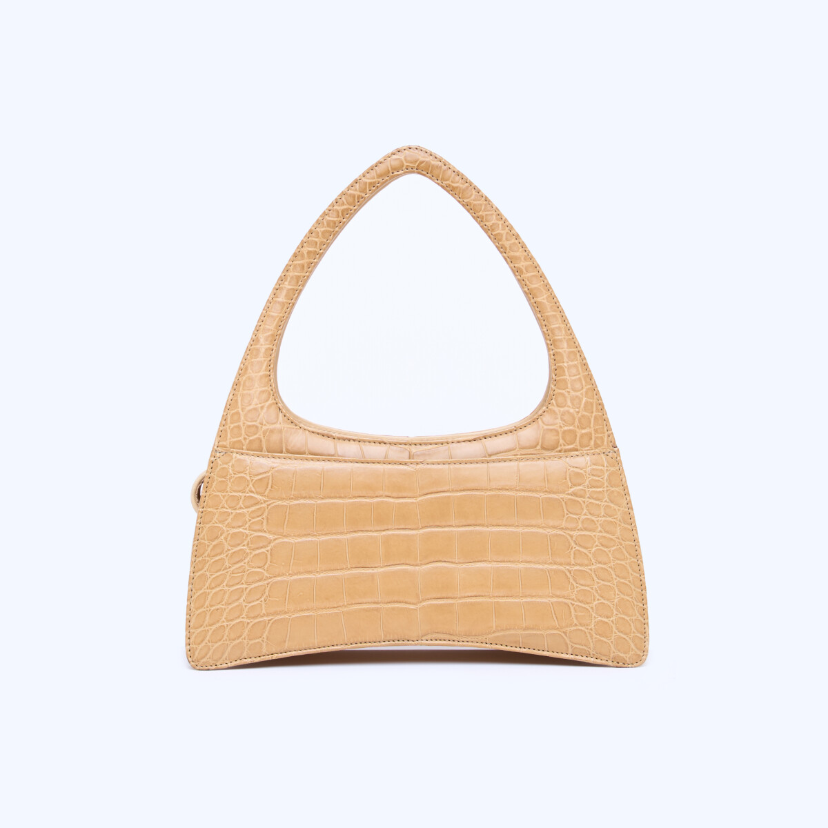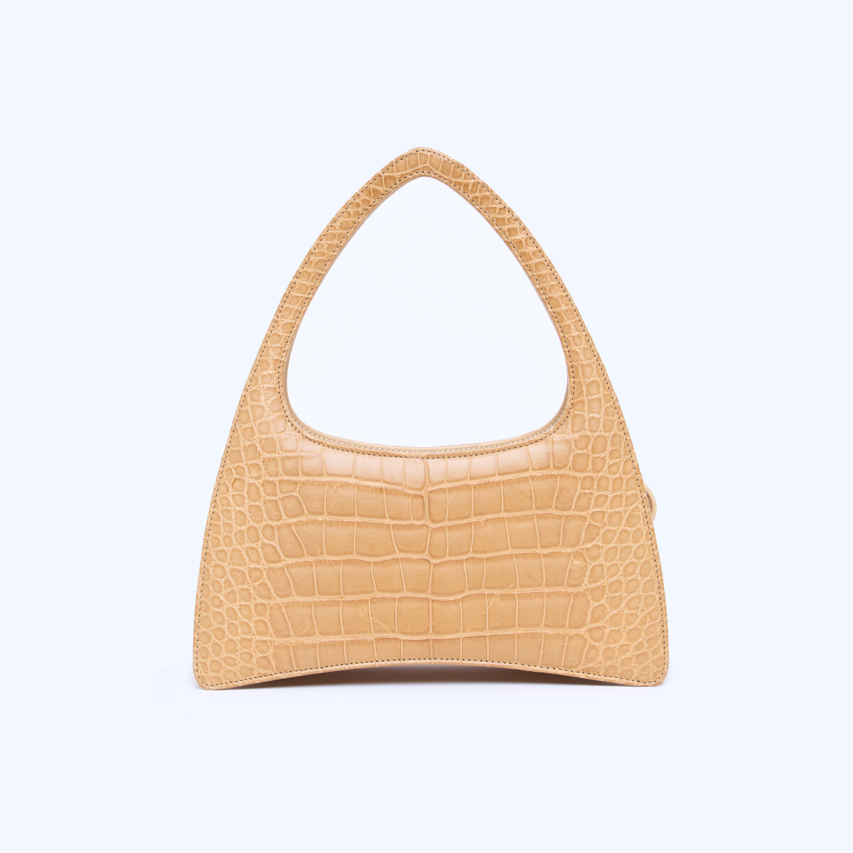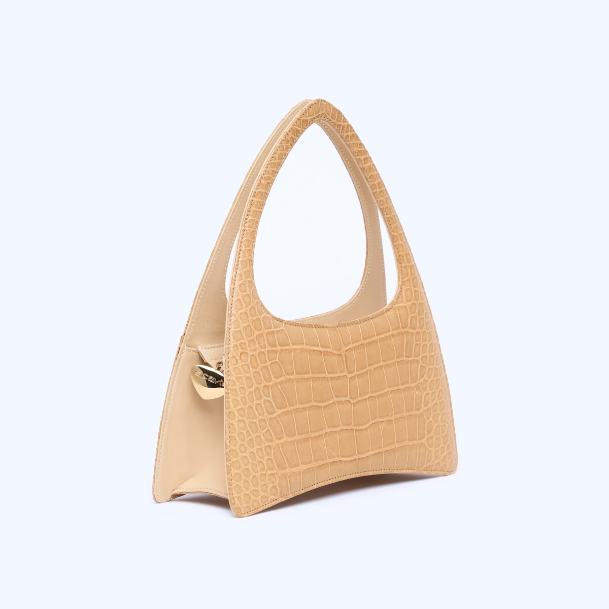 "Ellie" Triangle handbag, made of fine alligator leather and calfskin. Handmade closure with 3-micron gold plating.
