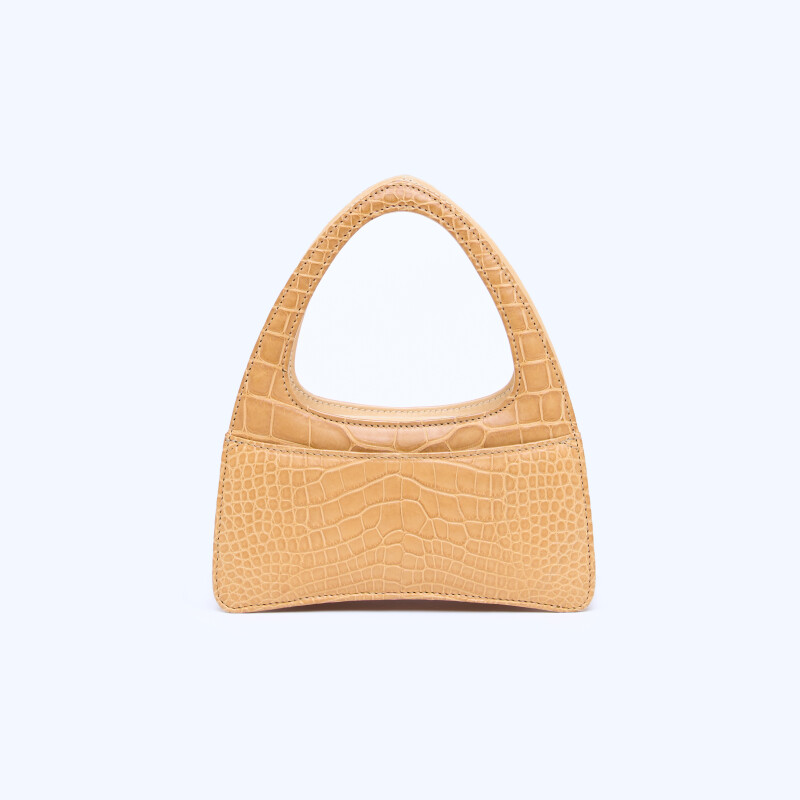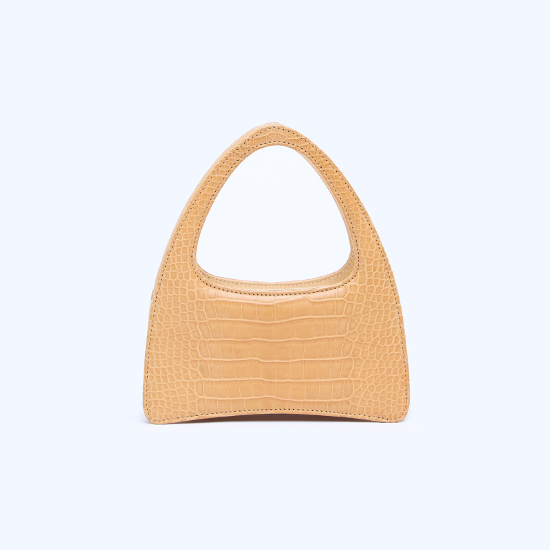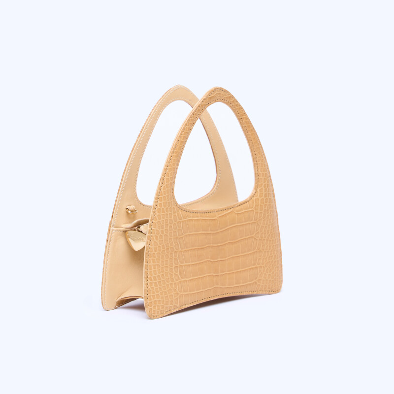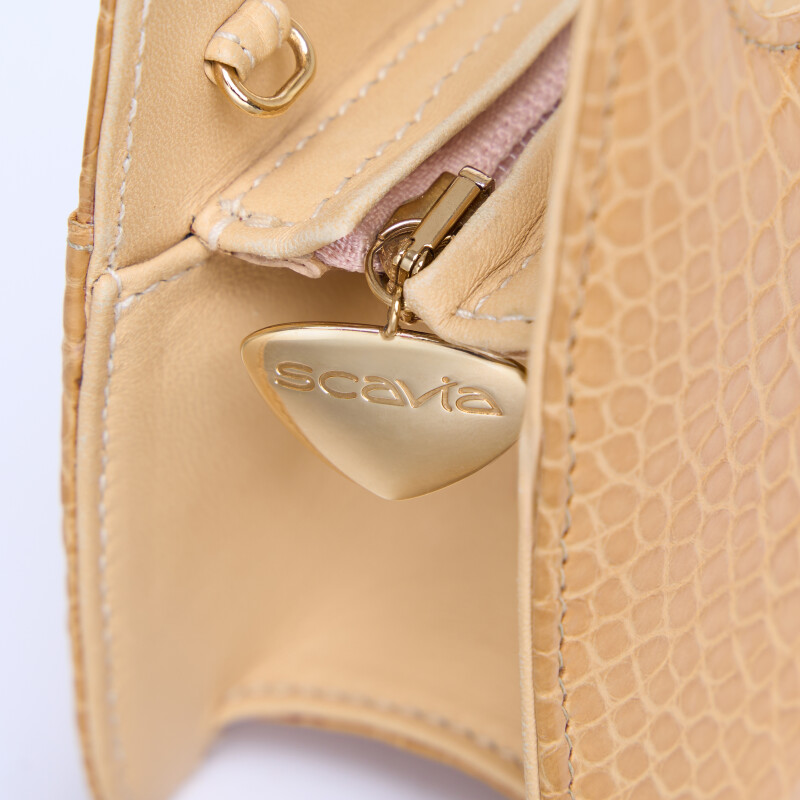 "Ellie" Triangle handbag, made of fine alligator leather and calfskin. Handmade closure with 3-micron gold plating.