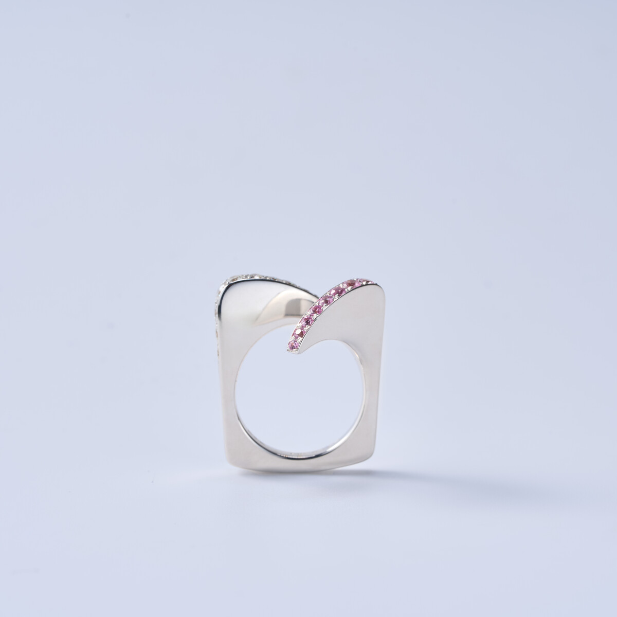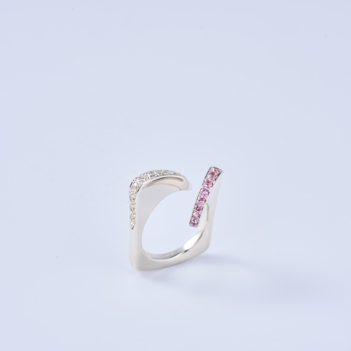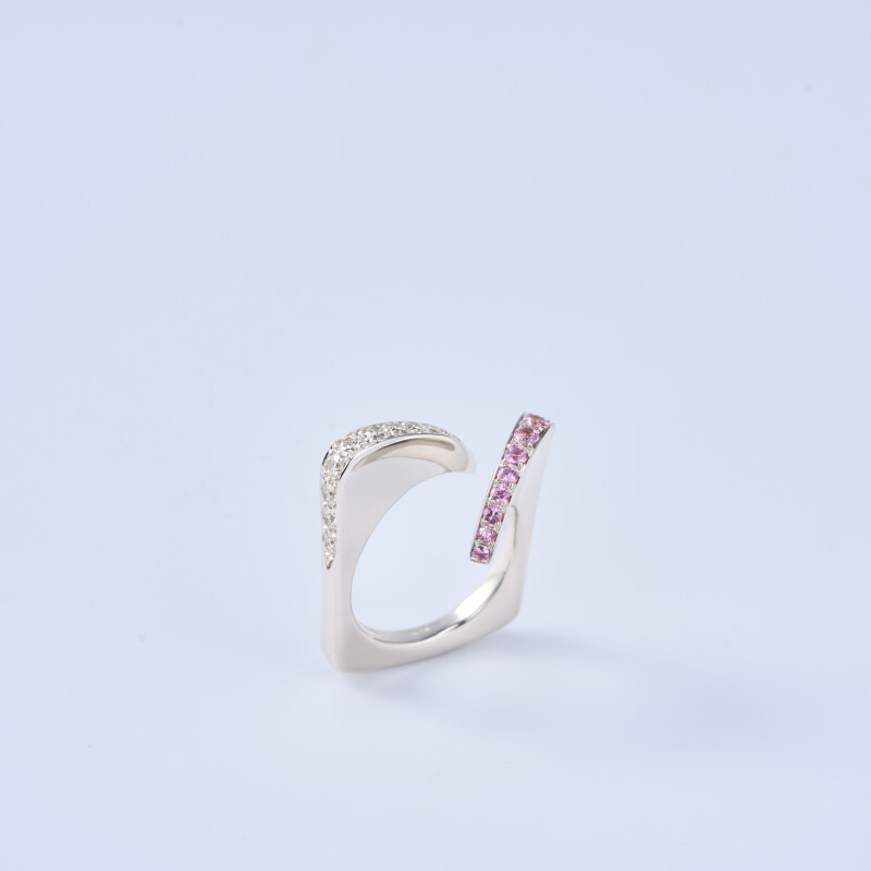 Made of 18kt white gold with pavé-cut diamonds and pink sapphires.