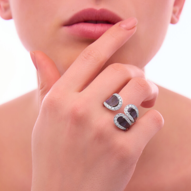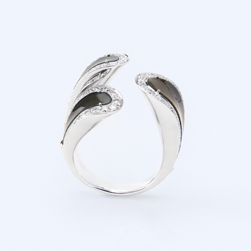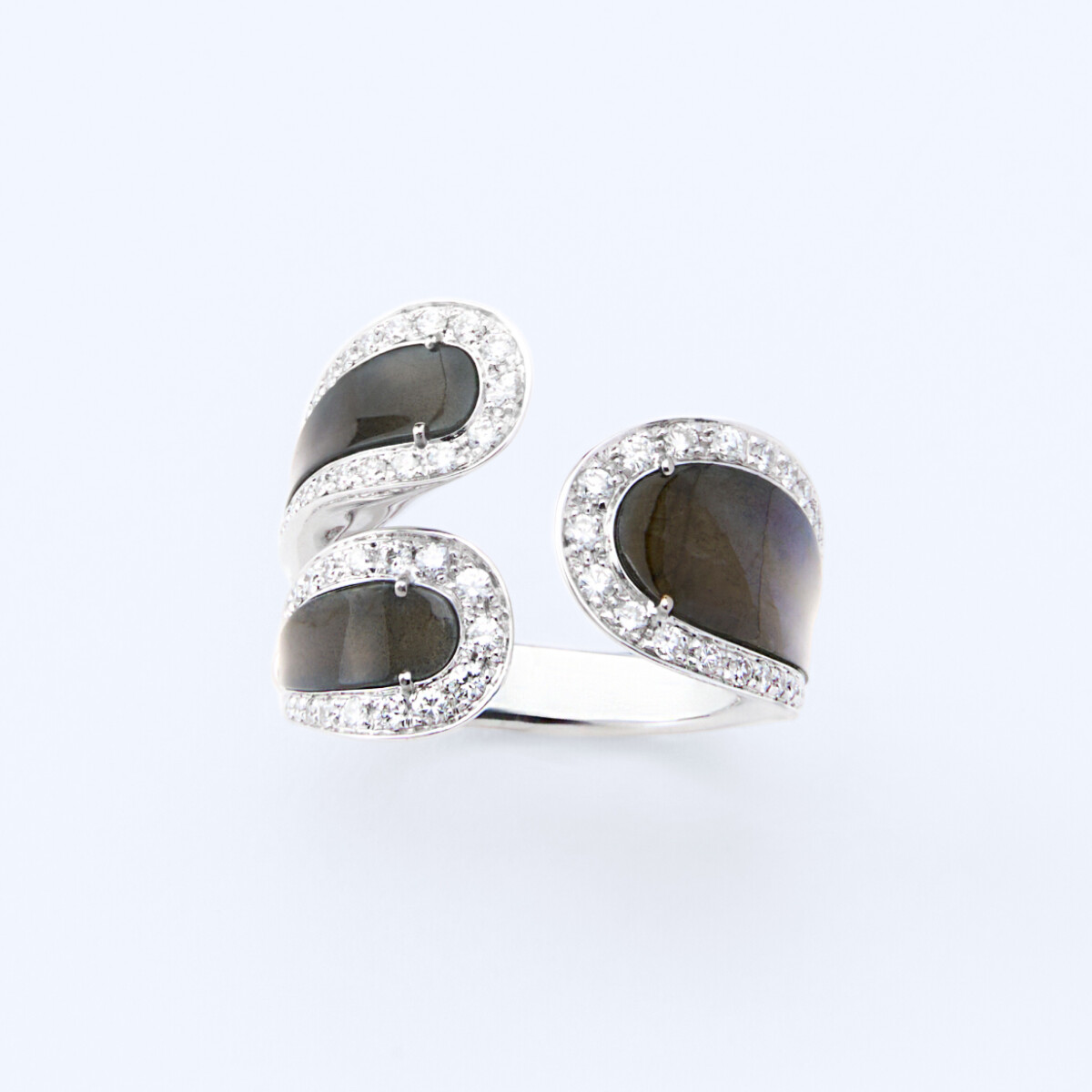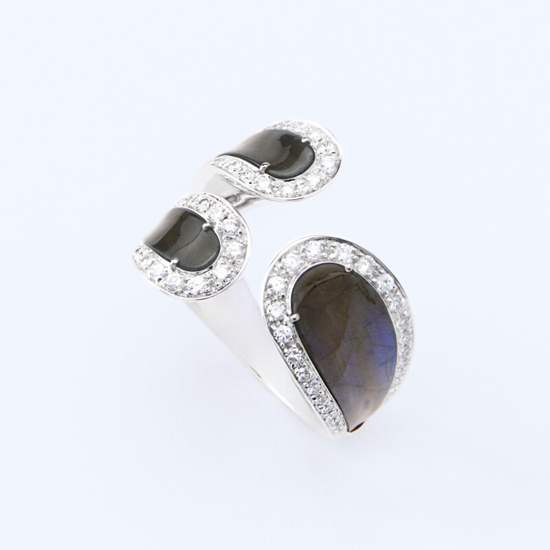 Made in 18kt white gold; high-quality brilliant cut white diamonds and inlaid Labradorite.