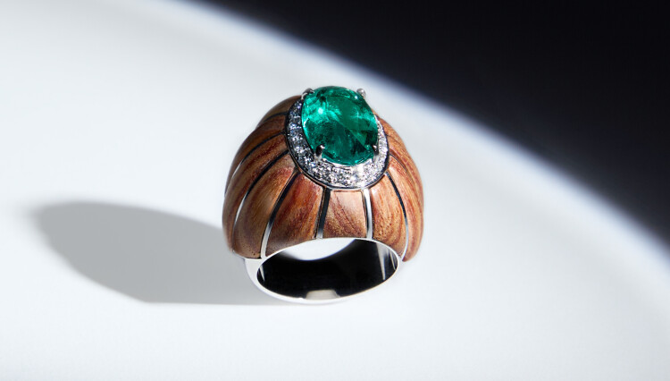 The harmonious union of 'bois de rose' wood and a brilliant Colombian emerald exceeding 5 carats creates an unexpected delight, perhaps the very surprise you have been seeking in a ring.