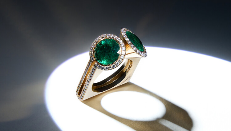Two beautiful round emeralds embraced by a very rigorous yellow gold geometry for this "Diamond International Award" winning ring.