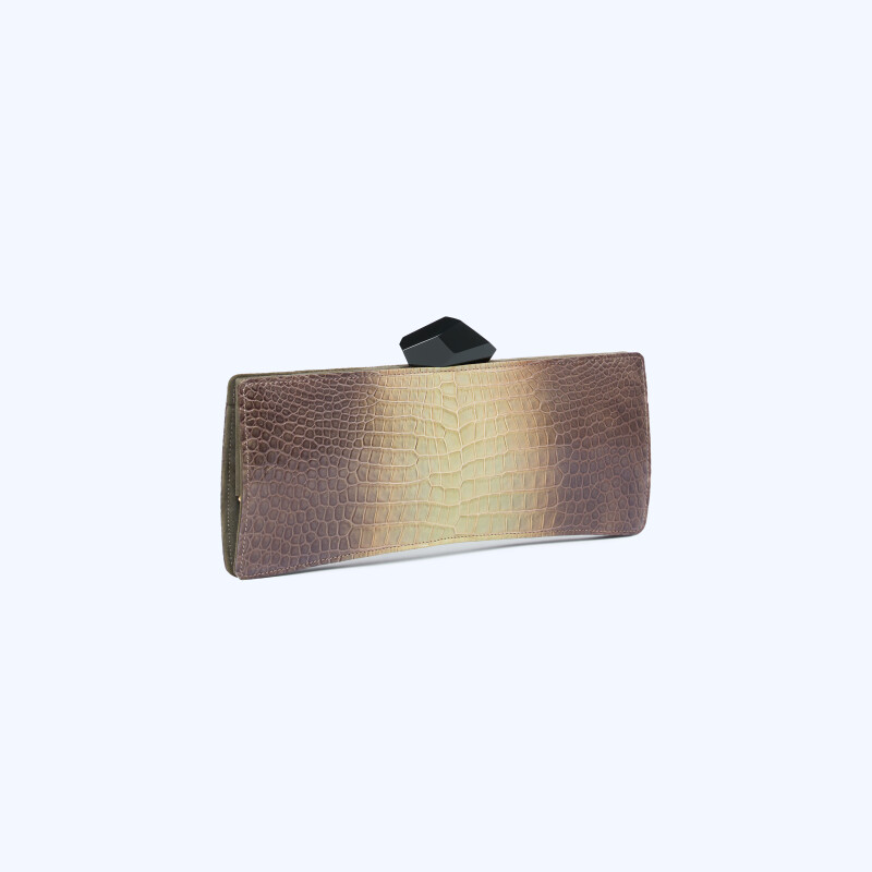 Pochette "Ashley" Cigarette, realizzata in pelle di coccodrillo con pulsoir in pietra d’ossidiana.