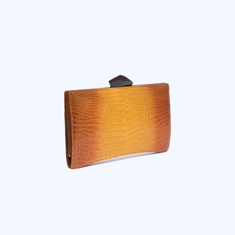 "Pochette Ashley, realizzata in pregiata pelle di Coccodrillo con pulsoir in pietra di falcon eye."