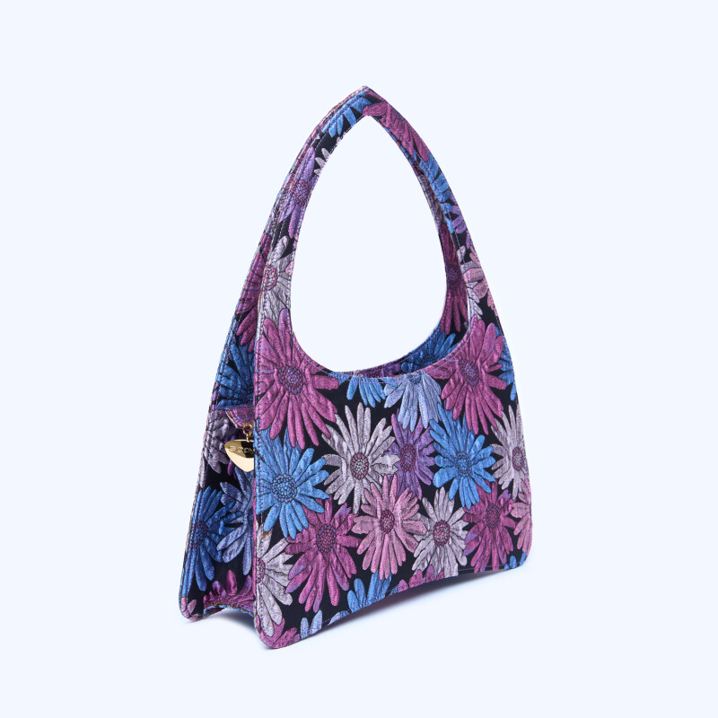 Borsa a mano "Ellie" flowers, fa parte della nostra collezione limitata, realizzata con pregiato tessuto floreale lilla. Chiusura realizzata artigianalmente in 3 micron d’oro giallo.