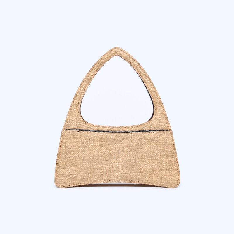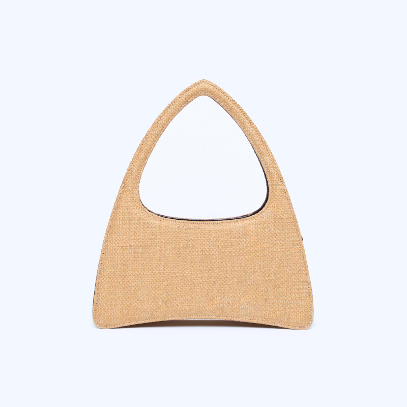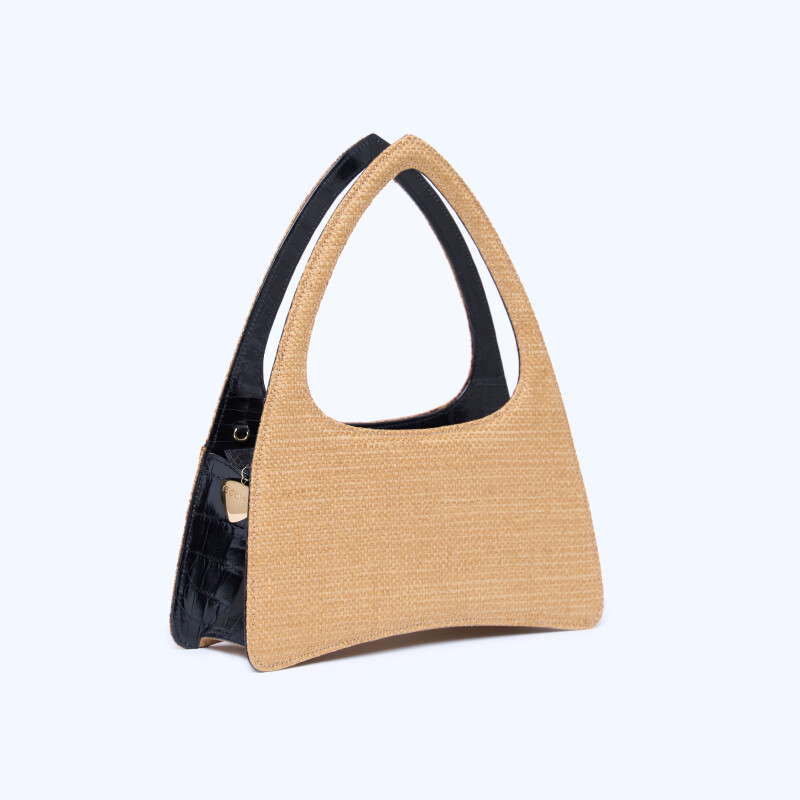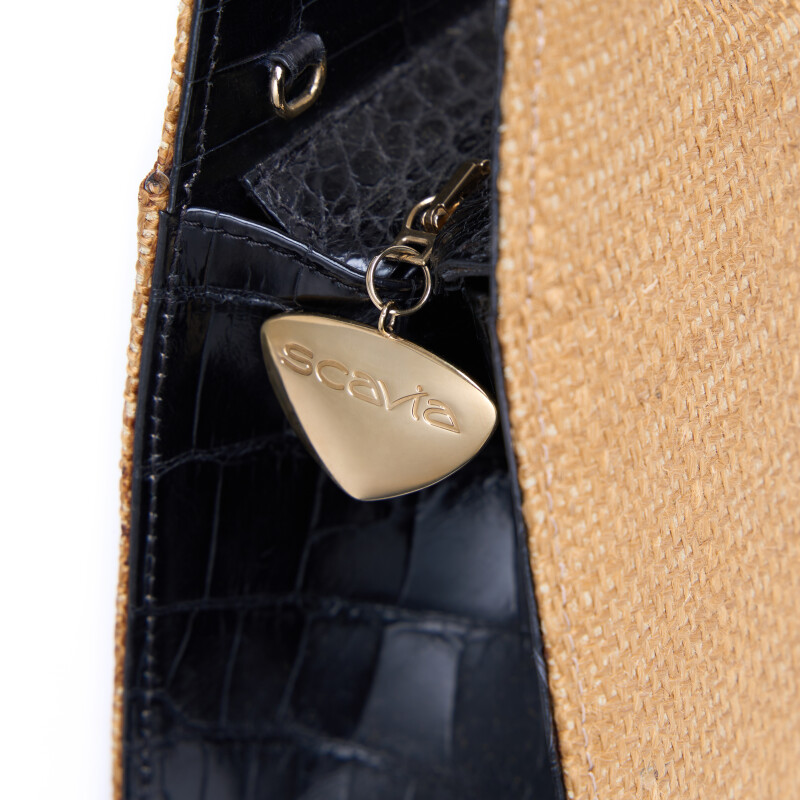 Borsa a mano Ellie Triangle, realizzata in pregiata pelle di alligatore e in fibra di juta. Chiusura realizzata artigianalmente in 3 micron d’oro giallo.