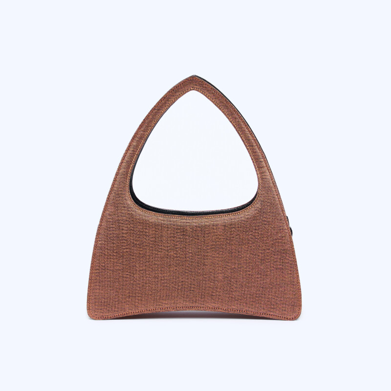 Borsa a mano Ellie Triangle, realizzata in tessuto con fili di rame intrecciati e dettagli in camoscio. Chiusura realizzata artigianalmente in 3 micron d’oro giallo.