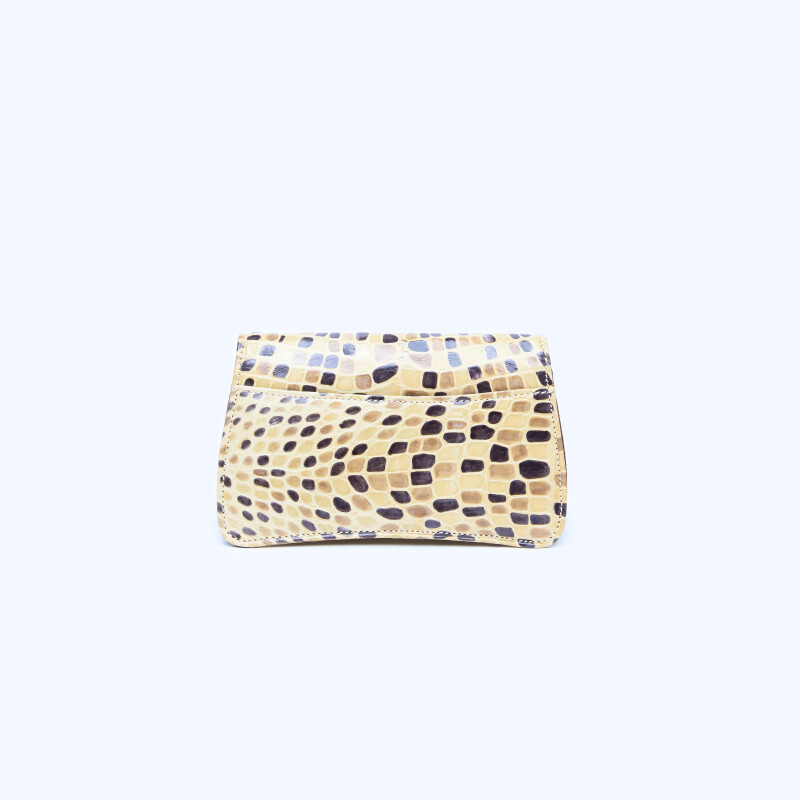 Pochette "Ellie" Arlequin, un'esclusiva creazione realizzata con maestria utilizzando pregiata pelle di Alligatore e dettagli in pelle di camoscio, dipinta a mano per un tocco unico. Chiusura realizzata artigianalmente in 3 micron d’oro giallo.