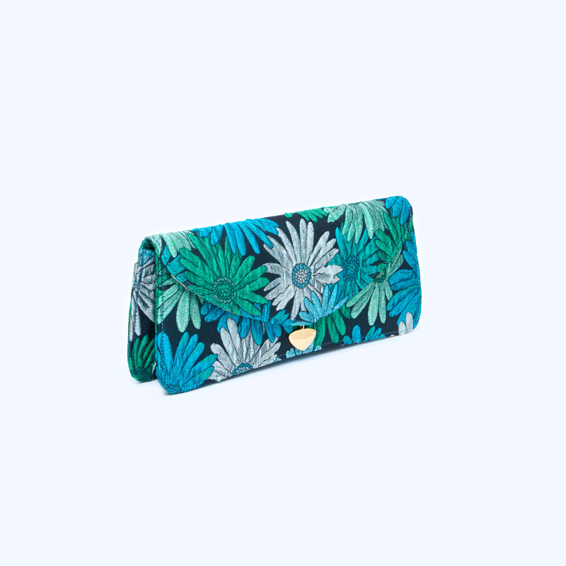 Pochette "Ellie" cigarette flowers, fa parte della nostra collezione, limitata realizzata con pregiato tessuto floreale verde. Chiusura realizzata artigianalmente in 3 micron d’oro giallo.