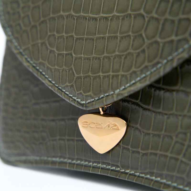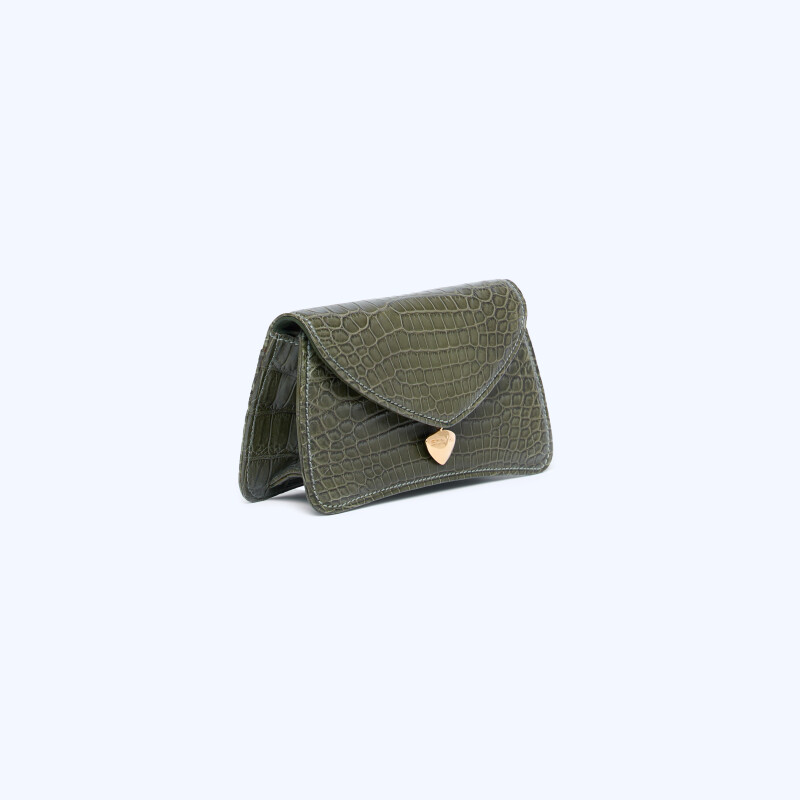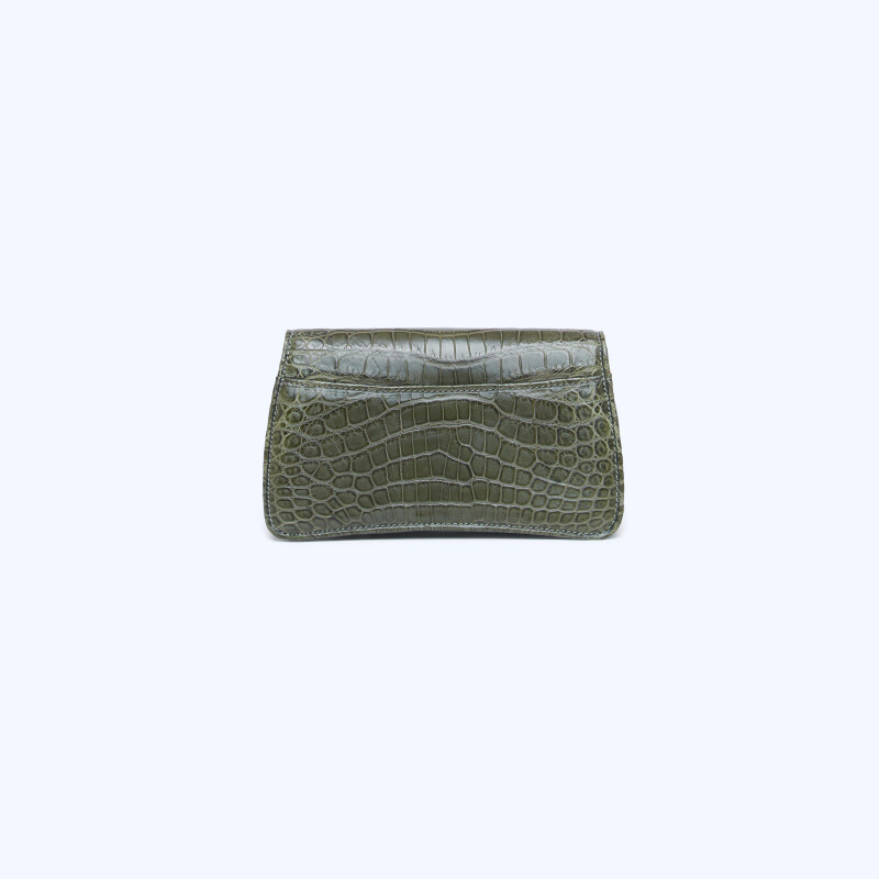 Pochette Ellie, realizzata in pregiata pelle di Alligatore. Chiusura realizzata artigianalmente in 3 micron d’oro giallo.