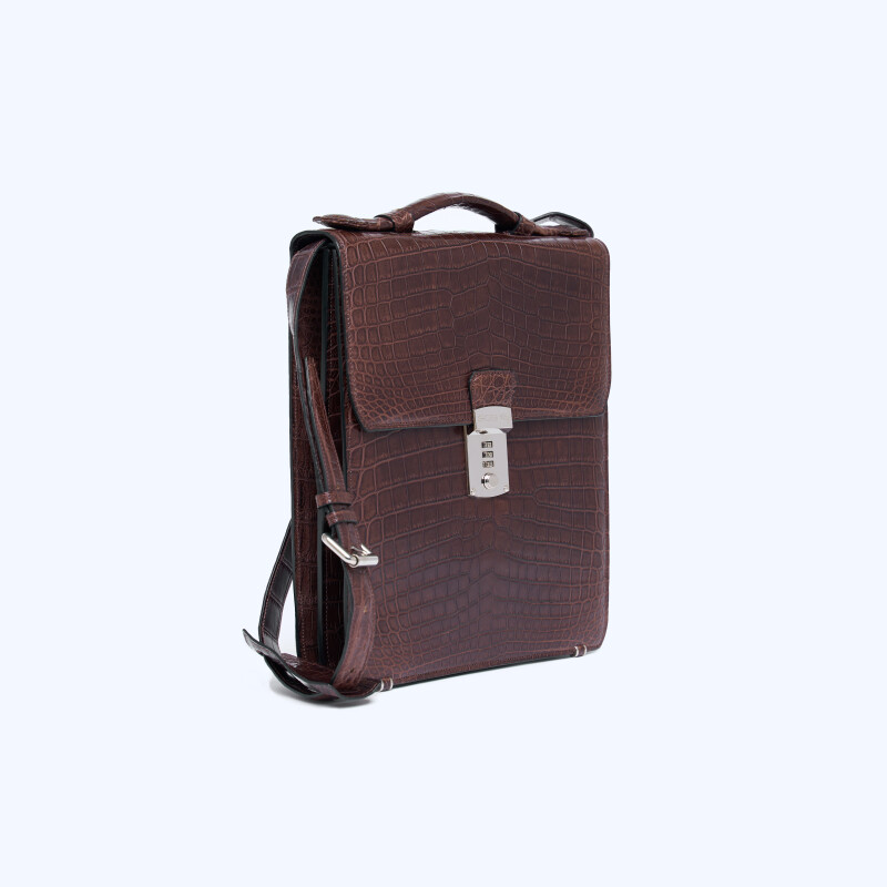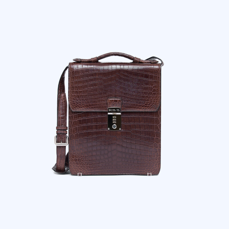 "Borsa a mano con tracolla da uomo, realizzata in pregiata pelle di alligatore, con chiusura a pressione e combinazione rifinita in 3 micron palladio."