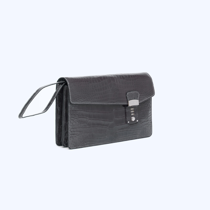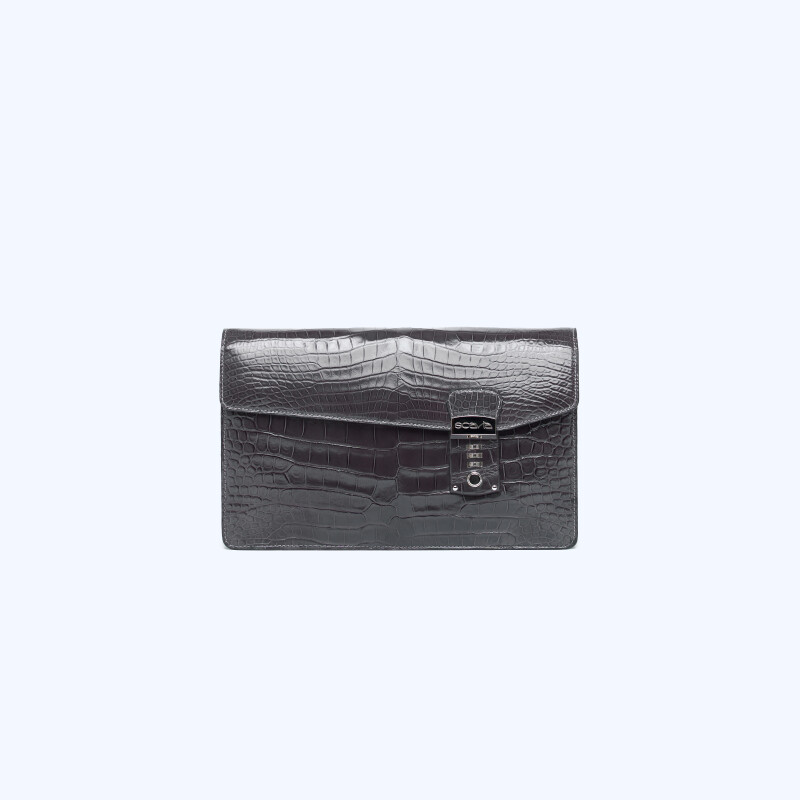 "Borsa a mano da uomo a tre sezioni, realizzata in pelle di coccodrillo e vitello, con chiusura a pressione e combinazione rifinita in 3 micron palladio."