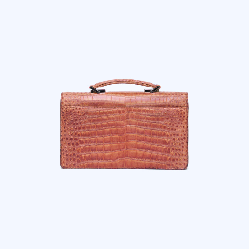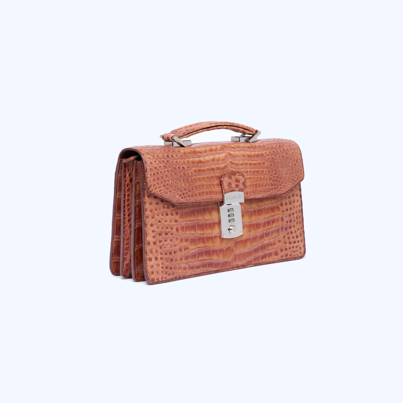 "Borsa a mano da uomo, realizzata in pregiata pelle di coccodrillo e Vitello, con chiusura a pressione e combinazione rifinita in 3 micron palladio."