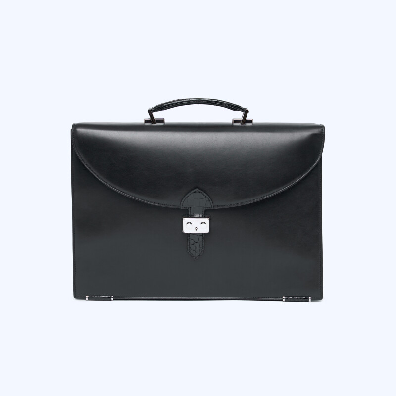 "Borsa a mano President, realizzata in pregiata pelle di vitello, con chiusura a pressione e chiave rifinita in 3 micron palladio."