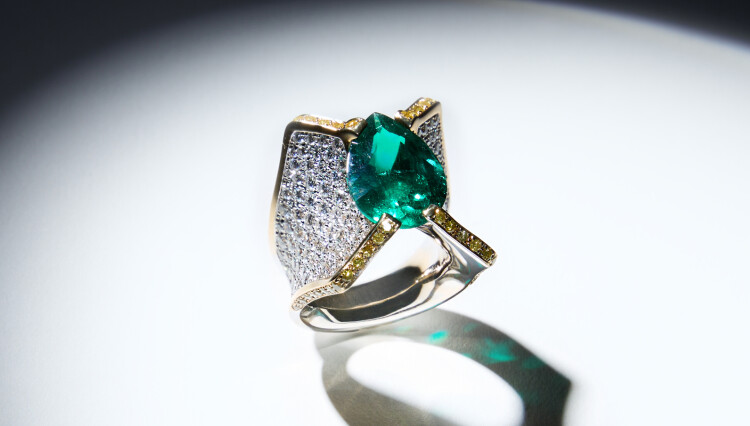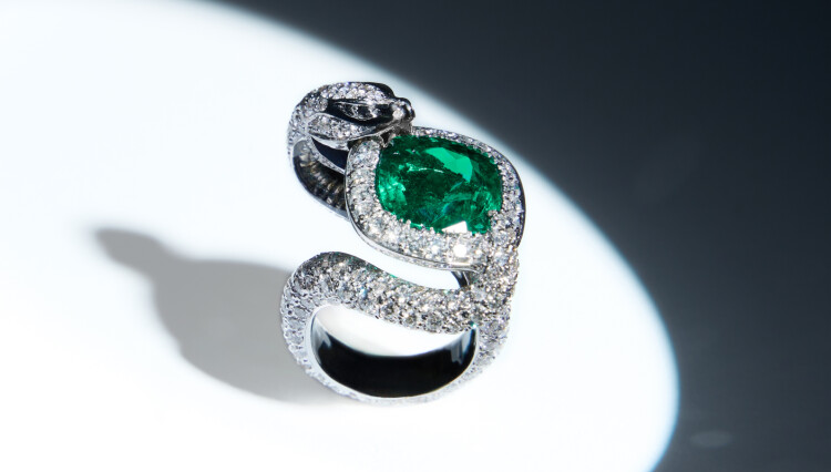 L'emblema della seduzione, l'eleganza esotica del gioiello è come un'esperienza di persuasione. Adornato con un incantevole smeraldo abbracciato dai diamanti.