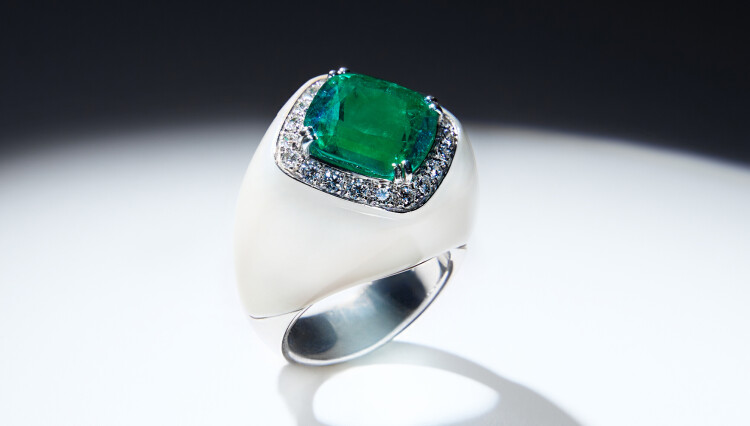 L’incontro del bianco dell’avorio con il purissimo verde di questo smeraldo colombiano cushion, di oltre 8 carati, da vita ad un classico dell’alta gioielleria SCAVIA.