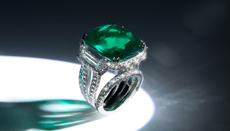 Dove un grande smeraldo colombiano di oltre 20 carati incontra la brillante di questo frame illuminato da due lunghe baguettes di diamanti bianchissimi…