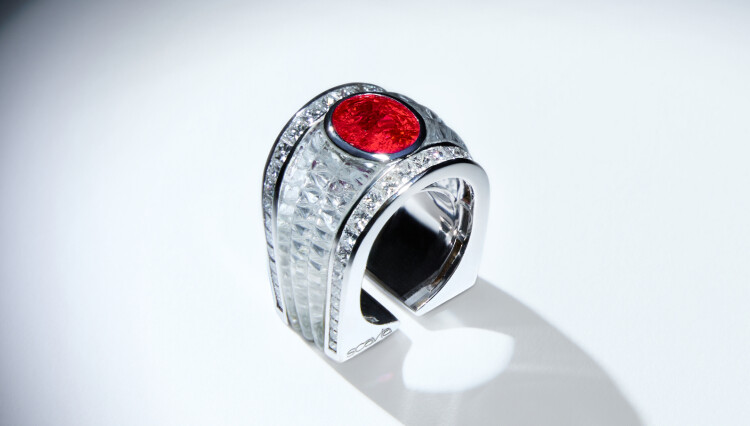 Nasce da un gesto nell’oro bianco, diamanti e quarzo ialino. Un’anello unico che racchiude un rubino birmano di oltre 5 carati.